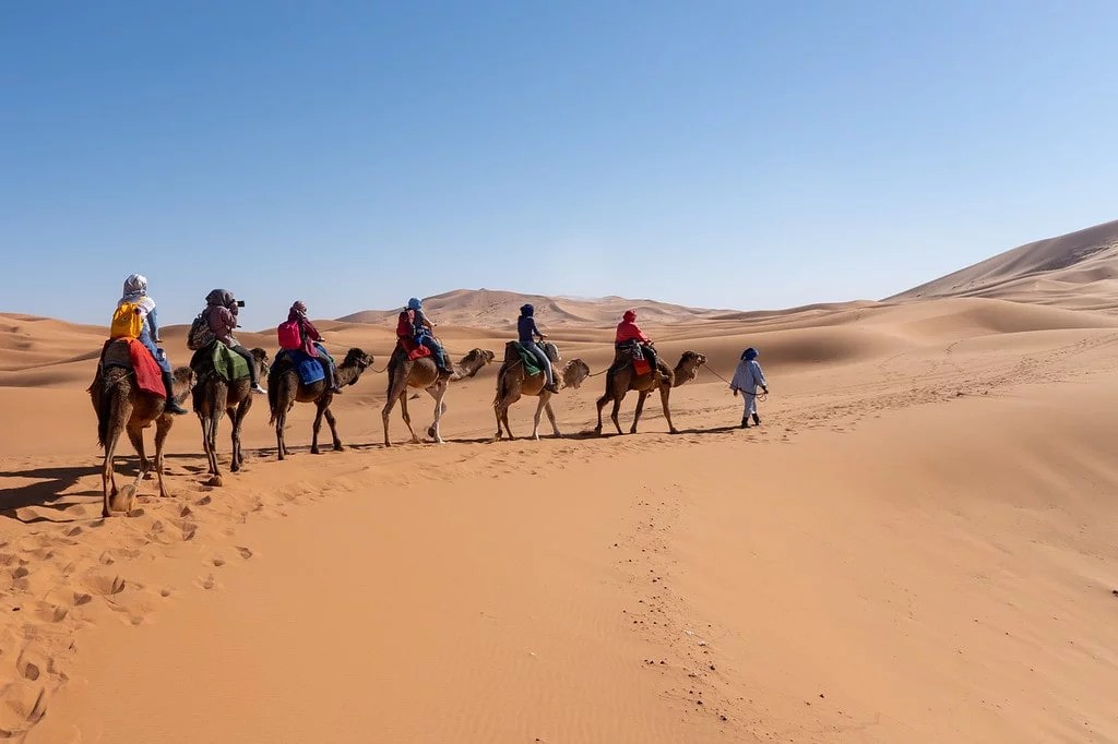 - Montez sur le dos des dromadaires pour traverser les dunes de l’Erg Chebbi et prenez des photos de votre groupe portant des turbans bleus.